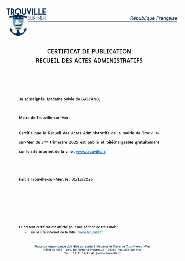 Hôtel de Ville – 164 boulevard Fernand Moureaux – 14360 Trouville-sur-Mer – 02 31 14 41 41 – contact@trouvillesurmer.fr